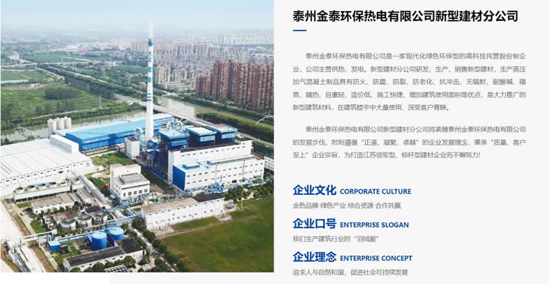 位于“水陆要津,咽喉据郡”之称的历史文化名城--江苏泰州,是一家现代化绿色环保、高新技术型民营股份制企业。公司主营供热、发电,致力于发展环保事业,奉献清洁能源。2020年3月成立金泰环保热电有限公司新型建材分公司,分公司是集研发、生产、设计、销售为一体的专业化新型建材企业。